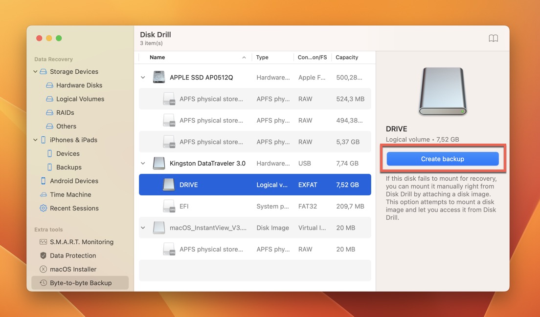 当遇到表明硬件问题的 SMART 错误时,最好的做法是立即备份数据。您可以使用 Disk Drill 等数据恢复工具创建整个驱动器的逐字节备份映像,并从映像中检索文件。保护数据后,请考虑更换磁盘。