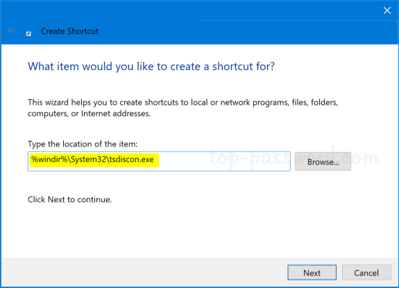 - 当创建快捷方式向导打开时,在位置框中输入会话断开实用程序 (C:\Windows\System32\tsdiscon.exe) 的完整路径,然后单击下一个。