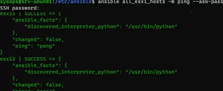 $ ansible all_esxi_hosts -m ping --ask-pass