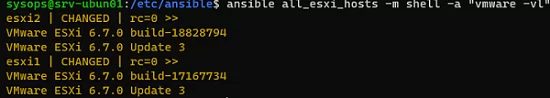 $ ansible all_esxi_hosts -m shell -a "vmware -vl"