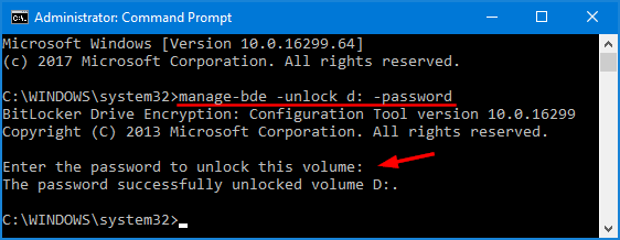 当然,您还可以从提升的命令提示符解锁 BitLocker 驱动器。只需键入此命令并按 Enter 键即可。