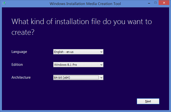- 该程序允许您选择所需的语言、Windows 8.1 版本和系统架构(32 位或 64 位)。就版本而言,您可以获得Windows 8.1、Windows 8.1 Pro、这两种操作系统的N个版本,或者单一语言的Windows 8.1版本。