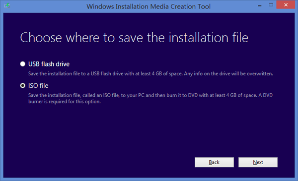 - 单击“下一步”按钮后,您将看到两个保存安装文件的选项:创建 Windows 8.1 安装 USB 驱动器或保存安装 ISO 映像以供以后用户使用。如果您手头没有 USB 驱动器,则应选择第二个选项将安装 ISO 映像保存在您的 PC 上,然后将其刻录到 DVD。