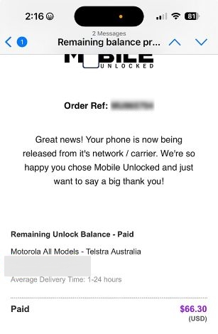 - 对于 Android 手机,您将通过电子邮件收到网络解锁代码。您还将收到有关如何使用它的说明。