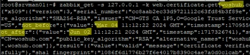 $ zabbix_get -s 127.0.0.1 -k web.certificate.get[woshub.com,443]