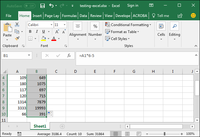 现在,我们假设您想在B列B中应用A1*6-5的公式。通常有两种方法可以实现此目标:拖动或不拖动自动填充手柄。