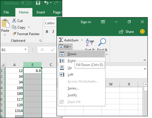 如果您不想使用快捷键盘,则可以使用充满Excel中的功能以在整列或行中应用公式。