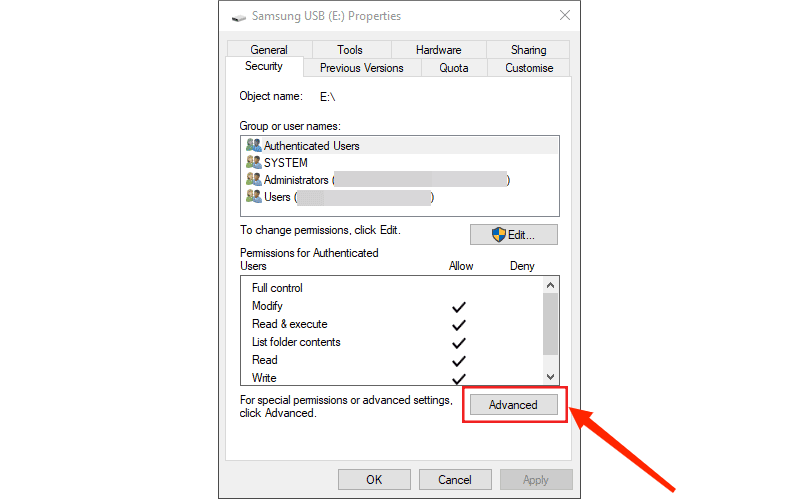 步骤2:选择“安全”选项卡>单击“高级”;