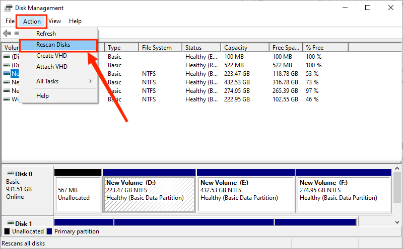 步骤 2:选择操作选项卡并选择重新扫描磁盘。然后等待扫描过程,一旦重新扫描成功,查看错误代码0x800707b1是否已解决。