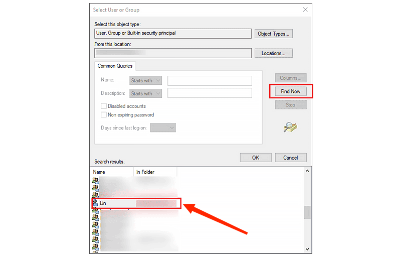 步骤 4:单击“立即查找”。然后选择您的用户名并单击“确定”;