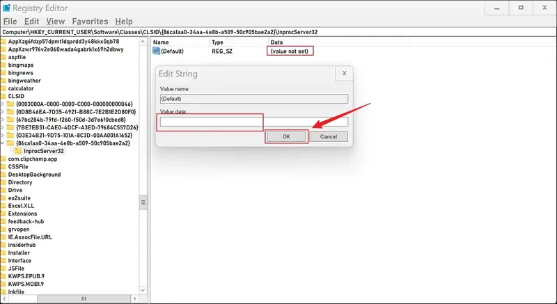 选择 InprocServer32 子项,然后双击右窗格中的(默认)值。