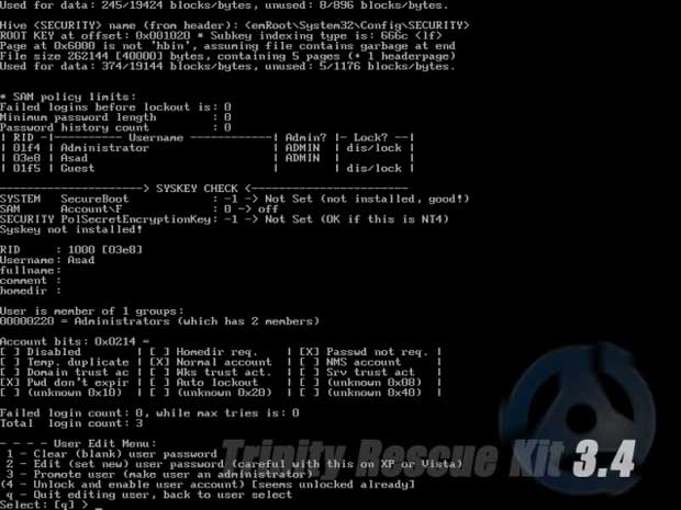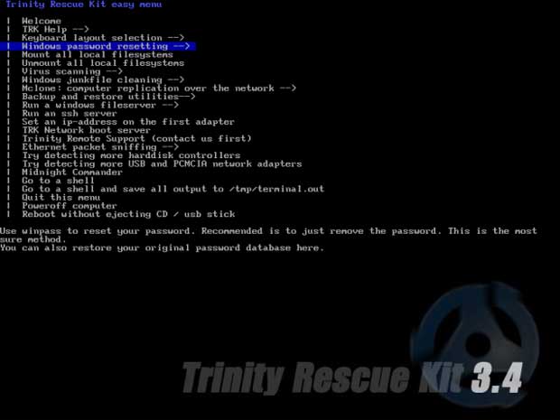 - 下载 Trinity Rescue Kit 的 ISO 映像并将其刻录到您的 CD 上。刻录光盘后,将其放入锁定计算机的 CD/DVD 驱动器中,然后让计算机从 Trinity Rescue CD 启动。
