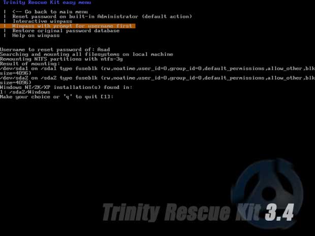 - 选择该选项后,您将获得重置丢失密码的方法列表。这里我们选择Winpass 首先提示输入用户名选项(Winpass 实际上只是 chntpw 工具的自动化脚本)。 TRK 会询问您要重置其密码的用户名。
