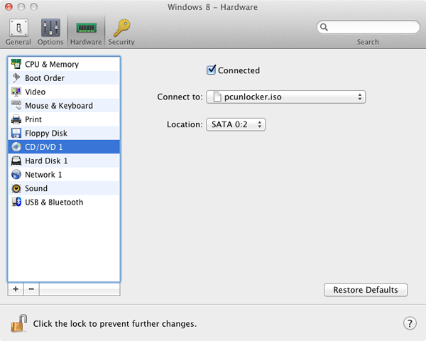 - 在虚拟机配置对话框中,选择硬件选项卡并选择光盘/DVD 1。确保已连接选项被选中。从“连接到:”下拉列表中,选择“选择图像文件”并找到您在步骤 1 中下载的 pcunlocker.iso 文件。