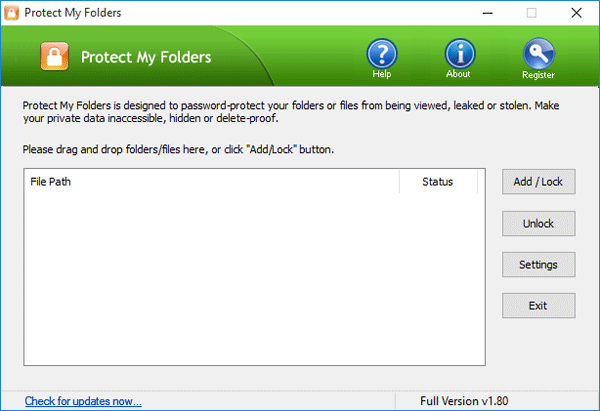 - 要锁定您想要密码保护的文件夹,只需将其从 Windows 资源管理器拖放到“保护我的文件夹”程序中即可。或点击“添加/锁定”按钮选择所需的文件夹。重复相同的过程以添加更多文件夹并锁定它们。