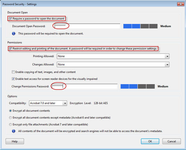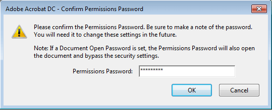 PDF 所有者密码:选中下面的框权限然后在“”旁边的字段中输入密码更改权限密码”。然后单击好的按钮。