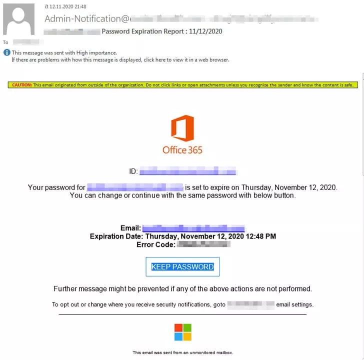 - “您的密码即将过期。”这可能是网络钓鱼信件最常见的例子。在这种情况下,该电子邮件会假装是由 Microsoft 支持团队发送的。然而,当你仔细观察时,你会发现一些可疑的细节。尤其是这样的邮件给人一种紧迫感,显得要求很高。