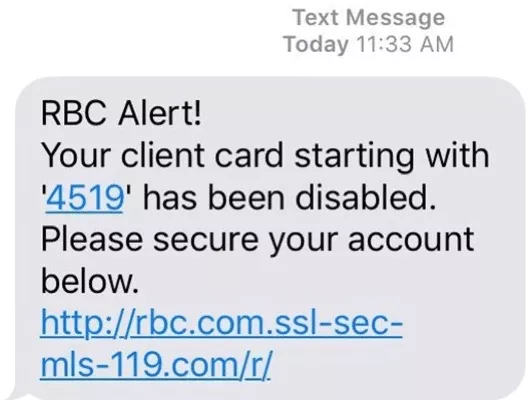 - “您的客户卡已被禁用。”这是短信试图迫使收件人立即采取行动的另一个例子。然而,细心的用户会注意到所提议的 URL 远非合法。