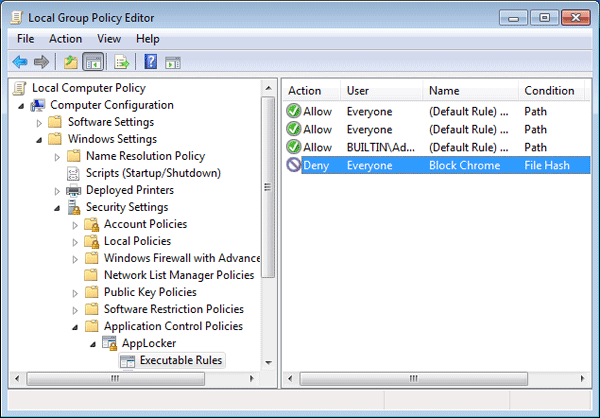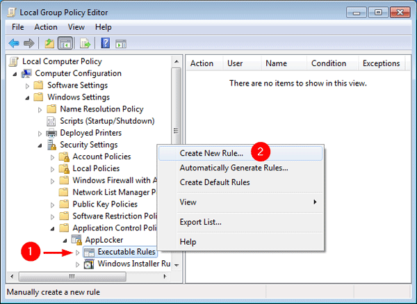 Computer Configuration -> Windows Settings -> Security Settings -> Application Control Policies -> AppLocker -> Executable Rules - 右键单击可执行规则在左侧窗格中,然后选择创建新规则。