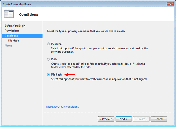 - AppLocker 规则可以使用以下条件识别程序:出版商,小路和文件哈希值。发布者条件依赖于可执行文件的数字签名。