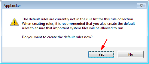 - 当提示创建默认规则时,请确保单击是的。这是为了确保您创建的规则不会阻止操作系统文件运行。