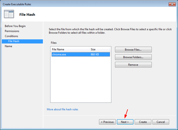 - 在文件哈希页面上,单击浏览文件并找到您想要应用此规则的应用程序的可执行文件,或者单击浏览文件夹如果您希望系统计算文件夹中所有可执行文件的哈希值。点击下一个。