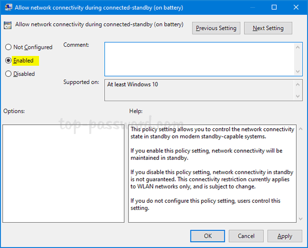 Computer Configuration -> Administrative Templates -> System -> Power Management -> Sleep Settings - 在右侧窗格中,您可以找到两个设置:“在连接待机期间允许网络连接(使用电池)“ 和 ”在连接待机期间允许网络连接(已插入)”。分别双击进行修改。