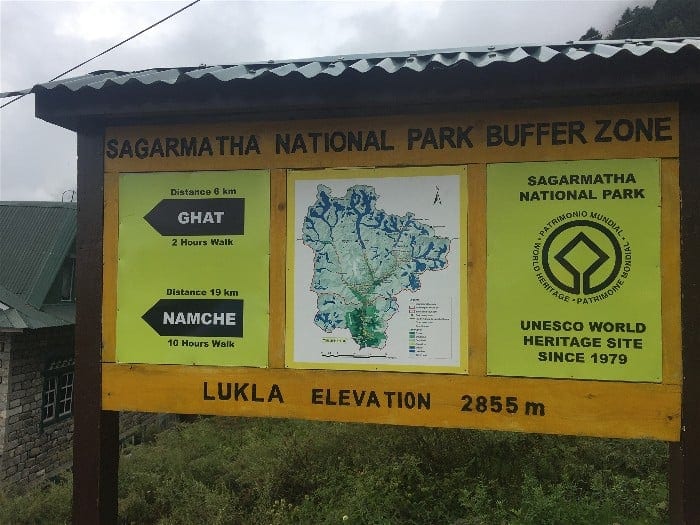 卢卡拉镇的欢迎标志:徒步旅行者首次介绍珠穆朗玛峰所在地萨加玛塔国家公园
