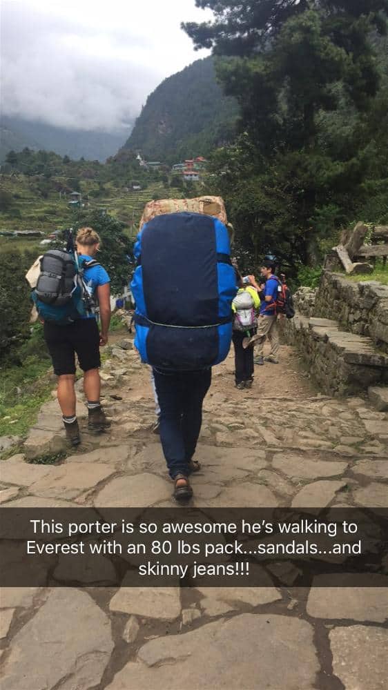 搬运工是一群令人印象深刻的人。他们日复一日地用临时草编背包和破烂的运动鞋或凉鞋将 60 磅到 80 磅的货物拖上山。每当我在路上看到他们时,当我背着超重的 22 磅背包和超级棒的 Lowa 靴子时,我都会感到谦卑。这次散步对我来说是一件很享受的事情。我几乎有任何可能发生的情况的药物。每天晚上,我睡在茶馆里,想吃什么就吃什么,而大多数搬运工则共用帐篷和毯子。他们在一个相当无情的地方过着极其艰苦的生活。如果我摔倒,有人会拿走我的信用卡并尽一切努力让我尽快返回加德满都。搬运工没有那么奢侈或保证。你想知道搬运工最令人震惊的事情是什么吗?他们微笑着。所有该死的时间。