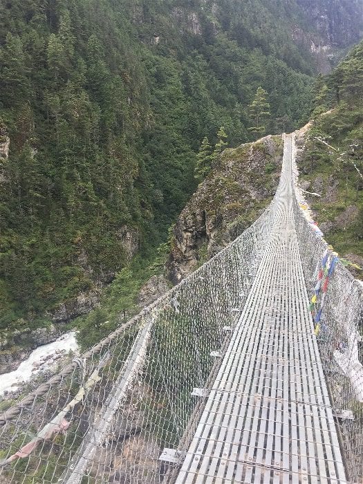 现在,还记得通往卢卡拉机场的陡峭山谷吗?想象一下它的一个稍微小一点的版本。现在想象一下,横跨这个山谷的是一座钢木板和缆索人行桥,其宽度只够一个人一次走过。下面是一条很长的落差和一条汹涌的河流。我知道这座桥相当安全,它在我身上断裂的几率与我中彩票的几率差不多,但我知道尼泊尔以其登山者而闻名……我不太确定它以其工程师而闻名。