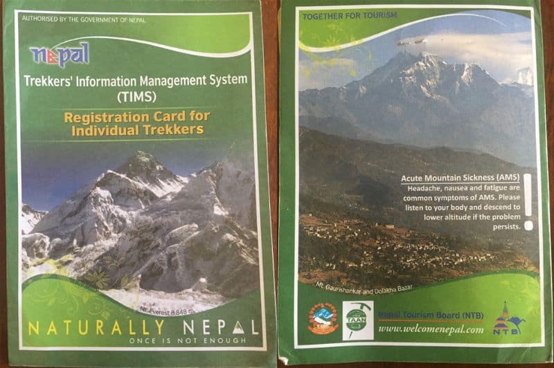Trekker 信息管理系统 (TIMS) 注册卡。不要失去这个!在整个珠穆朗玛峰大本营徒步旅行以及离开萨加玛莎国家公园时您都需要它