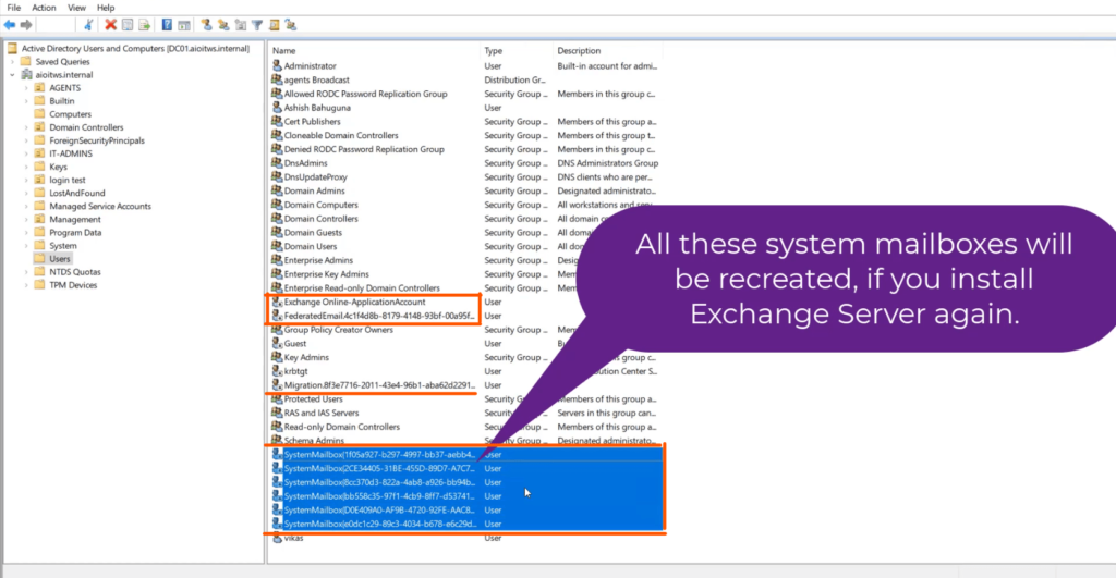 因此,我们的 Active Directory 中的 Users OU 下仍然有默认生成的 Exchange 用户帐户和系统邮箱