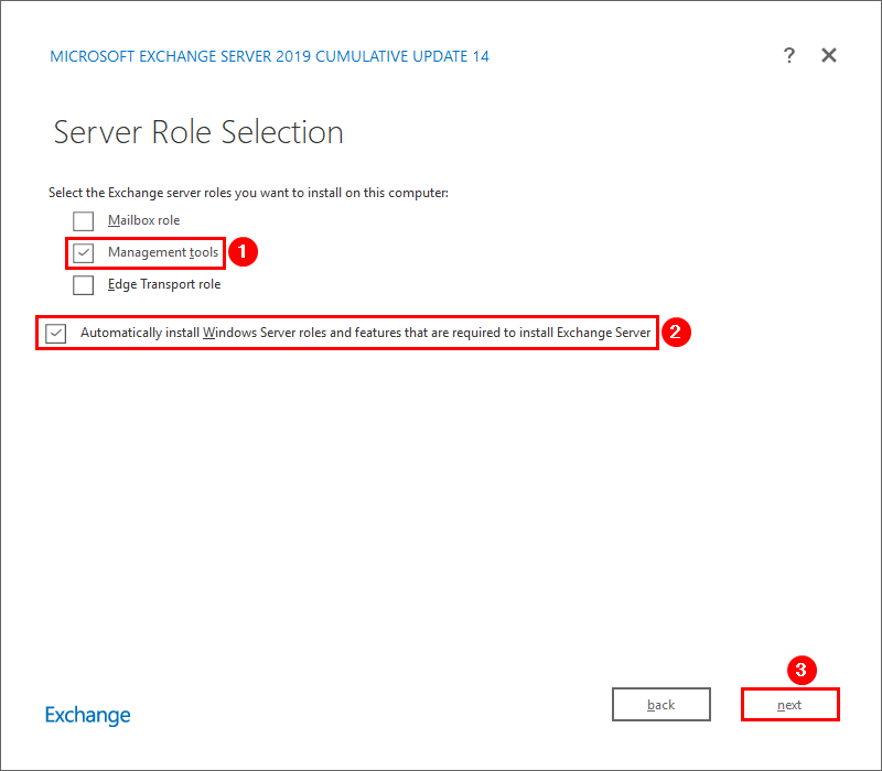 - 选择自动安装安装 Exchange Server 所需的 Windows Server 角色和功能。