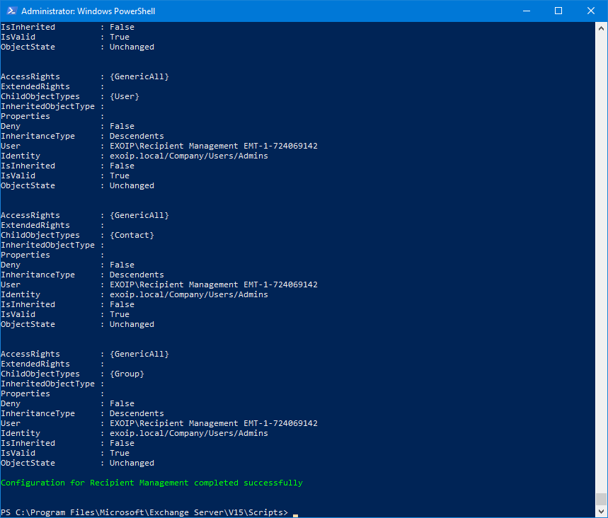 Removing permissions for Exchange Security Groups on CN=Recipient Policies,CN=EXOIP,CN=Microsoft Exchange,CN=Services,CN=Configuration,DC=exoip,DC=local