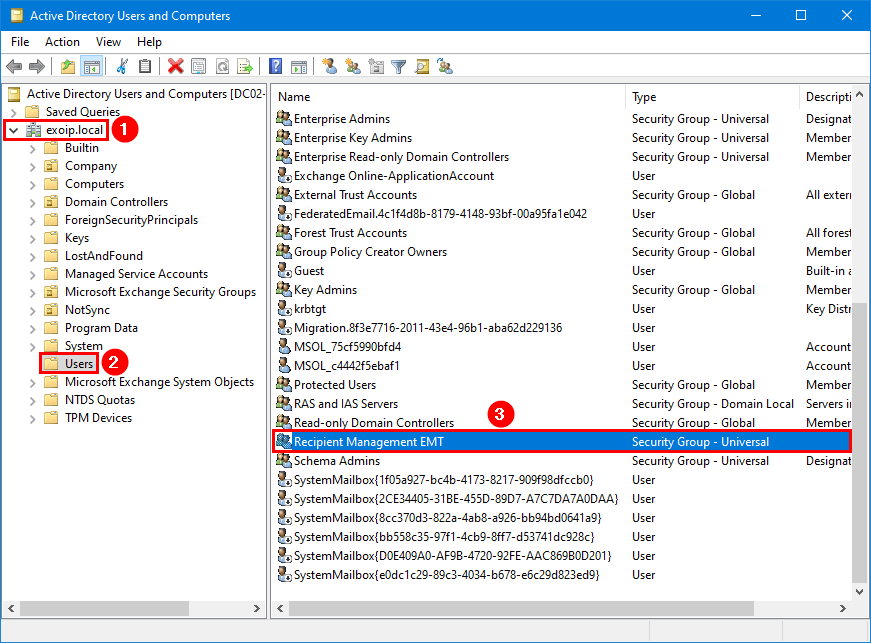 Removing permissions for Exchange Security Groups on CN=EXOIP,CN=Microsoft Exchange,CN=Services,CN=Configuration,DC=exoip,DC=local