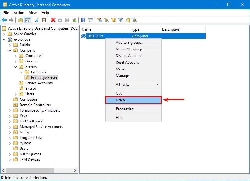 您现在可以从 Active Directory 用户和计算机中删除 Exchange 混合 AD 计算机对象。