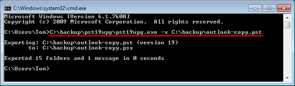 C:\backup\pst19upg.exe -x C:\backup\outlook-copy.pst