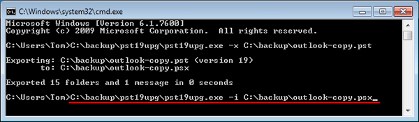 C:\backup\pst19upg.exe -i C:\backup\outlook-copy.psx