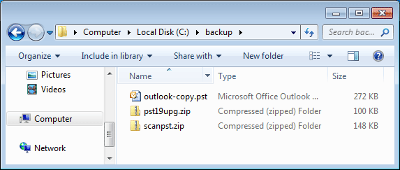 - 下载这两个实用程序pst19upg.zip和scanpst.zip,将它们保存到您的本地文件夹C:\ backup和unzip。 PST19UPG.EXE是Outlook 2003甚至较旧版本的内置工具,而您可以从任何Outlook版本访问Scanpst.exe。