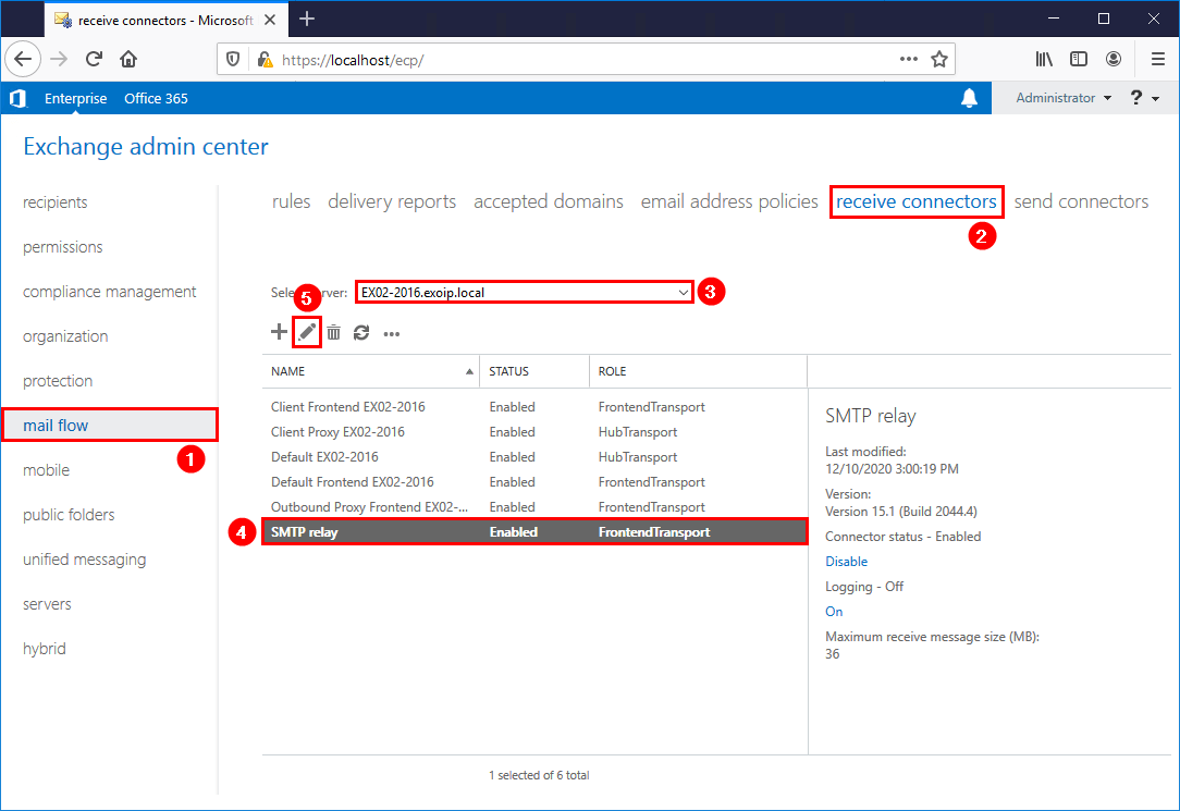 在我们的示例中,它是 Exchange Server EX02-2016.exoip.local 和 SMTP 中继接收连接器。