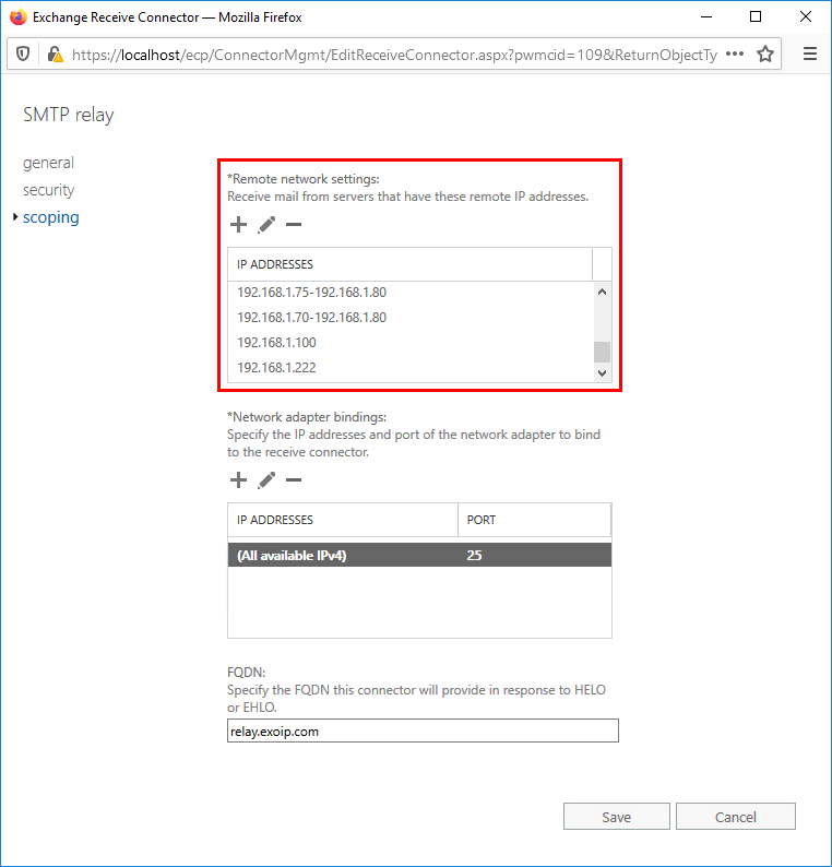 IP address 192.168.1.75-192.168.1.80 removed from receive connector EX02-2016SMTP Relay