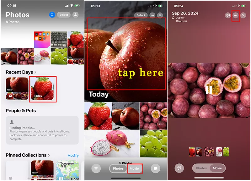 带有iOS 18的iPhone Photos应用程序将不再由四个部分(包括库)显示,适合您,专辑和搜索。相反,它垂直安排所有部分。设置图像到幻灯片在iOS 18中手动执行以下步骤: