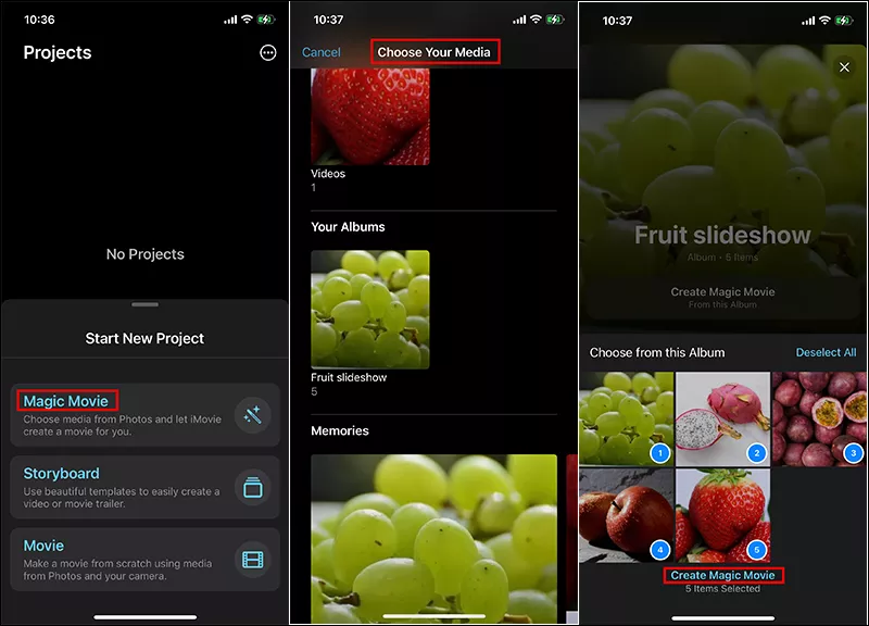 步骤3:然后从专辑中选择您的媒体,然后在选择照片后点击创建魔术电影。