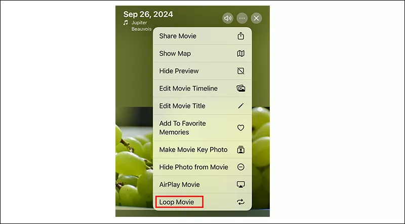 步骤4:单击右上角的三个点以打开设置选项,然后选择“循环电影“然后,内存将开始重复播放。