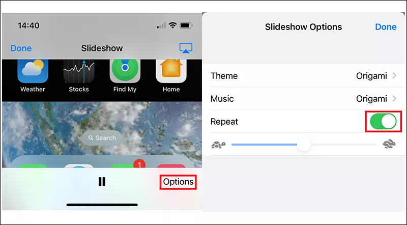 步骤6:寻找 ”重复”选项,然后将开关打开。点击“完毕”要返回播放照片幻灯片。它将自动循环播放,只停止直到您手动退出。