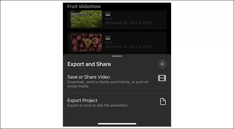 步骤6:对幻灯片满意后,点击完成,然后点击共享按钮以导出幻灯片。您可以直接从iMovie播放它,也可以将其保存到您的照片应用程序中,以方便访问。