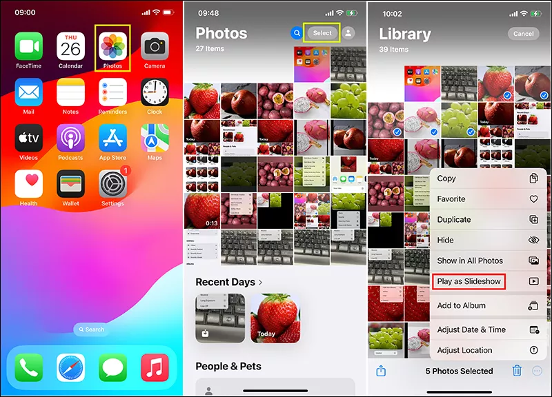 这将自动使用您选择的照片创建幻灯片,并立即开始播放。到iPhone/iPad上照片中的循环幻灯片,请执行以下步骤: