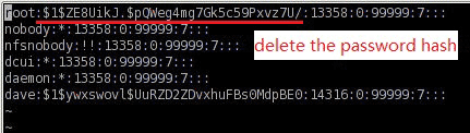 或者,您可以完全删除哈希值(第一个冒号和第二个冒号之间的所有内容)并以 root 身份登录服务控制台,无需密码。