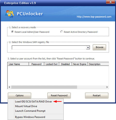 - 等待 PCUnlocker 程序启动。该程序可能会提示您选择 SAM 文件,因为它无法识别您的硬盘驱动器。因此您必须即时加载 RAID 驱动程序。单击选项按钮,然后选择“加载 IDE/SCSI/SATA/RAID 驱动程序”。