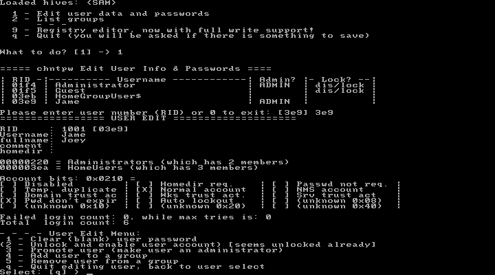- 接下来键入 q 退出 NTPasswd 工具,然后键入 y 保存密码重置更改。按 Ctrl + Alt + Del 重新启动计算机。您应该能够毫无问题地登录 Windows — 请记住将密码更改为您仍然可以轻松记住的复杂密码。